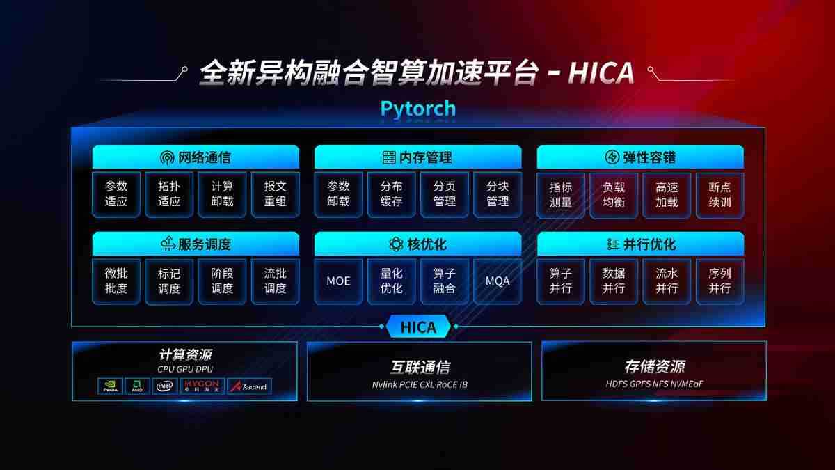 通过自研的服务层、、、中间适配层、、、以及调度编排算法,,,,采用数据并行、、、、模型并行等多种并行方式,,,把并行计算任务进行有效的分解,,使其分别由相应的软件栈和算力资源来承接。。。。当GPU资源变化,,HICA可以实时动态调度计算子任务并调整模型拓扑和架构,,以充分聚合各种算力资源。。。