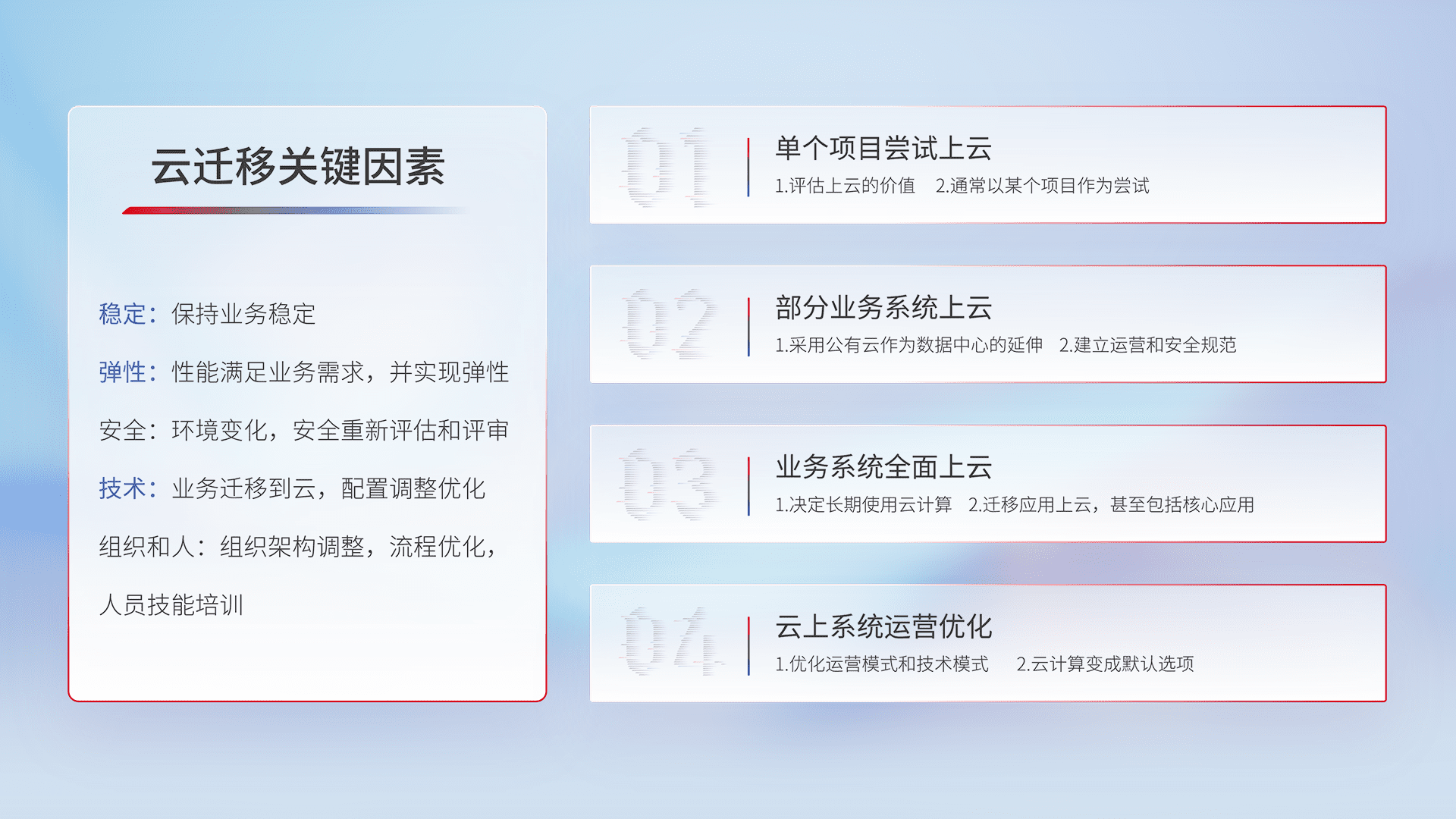 结合实际业务,,,,从规划设计、、、云平台选型、、、云原生改造、、、数据迁移、、、集成交付,,,迁移全过程为客户识别最佳上云路径,,,做好风险识别管理,,设计网络架构、、、身份权限、、安全审计合规、、、、操作审计、、、、日志审计、、、、监控告警策略、、、多站点容灾设计等,,对云上基础设施进行整体规划,,提升IT治理水平,,,,以满足弹性、、、、高可用、、、、高性能的需求。。