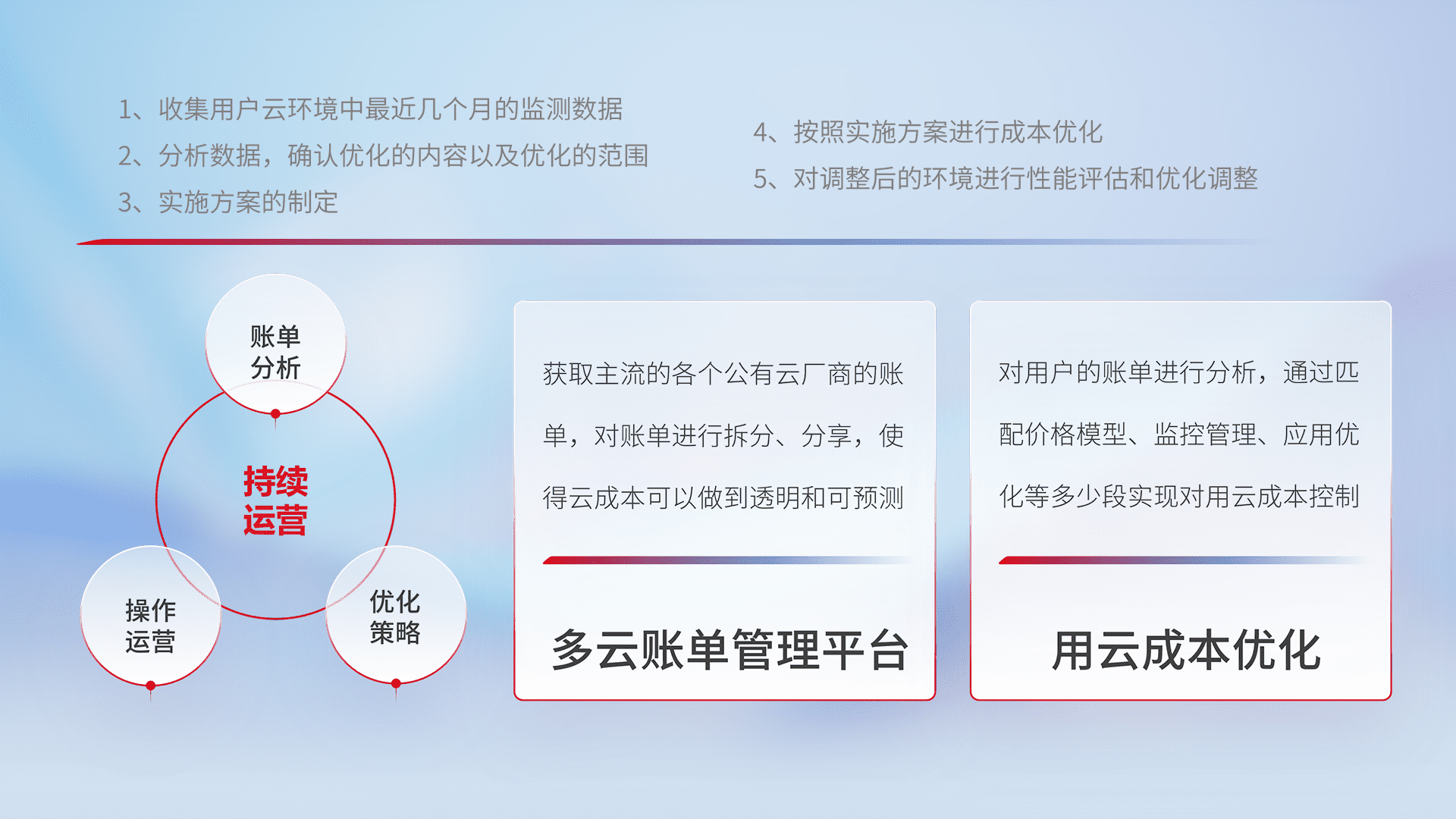 通过多云纳管,,,,以统一的资源数据模型把客户的云资源进行抽象和封装,,,进而实现对多云资源的统一操作,,保障云资源管理的可靠性、、、、稳定性与可用性。。量身定制化运维内容,,,配置、、开发运维、、补丁管理、、、备份、、、监控、、认证和访问管理、、、审计和日常巡检等,,,,保障在用云过程中的可靠度,,,,稳定度以及高可用率。。。。